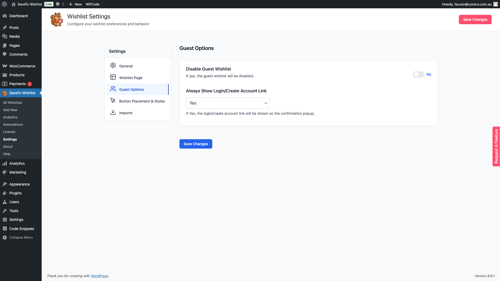 To open the Guest Options settings, go to SaveTo Wishlist → Settings in your WordPress admin, then click the Guest Options tab in the left-hand settings panel.