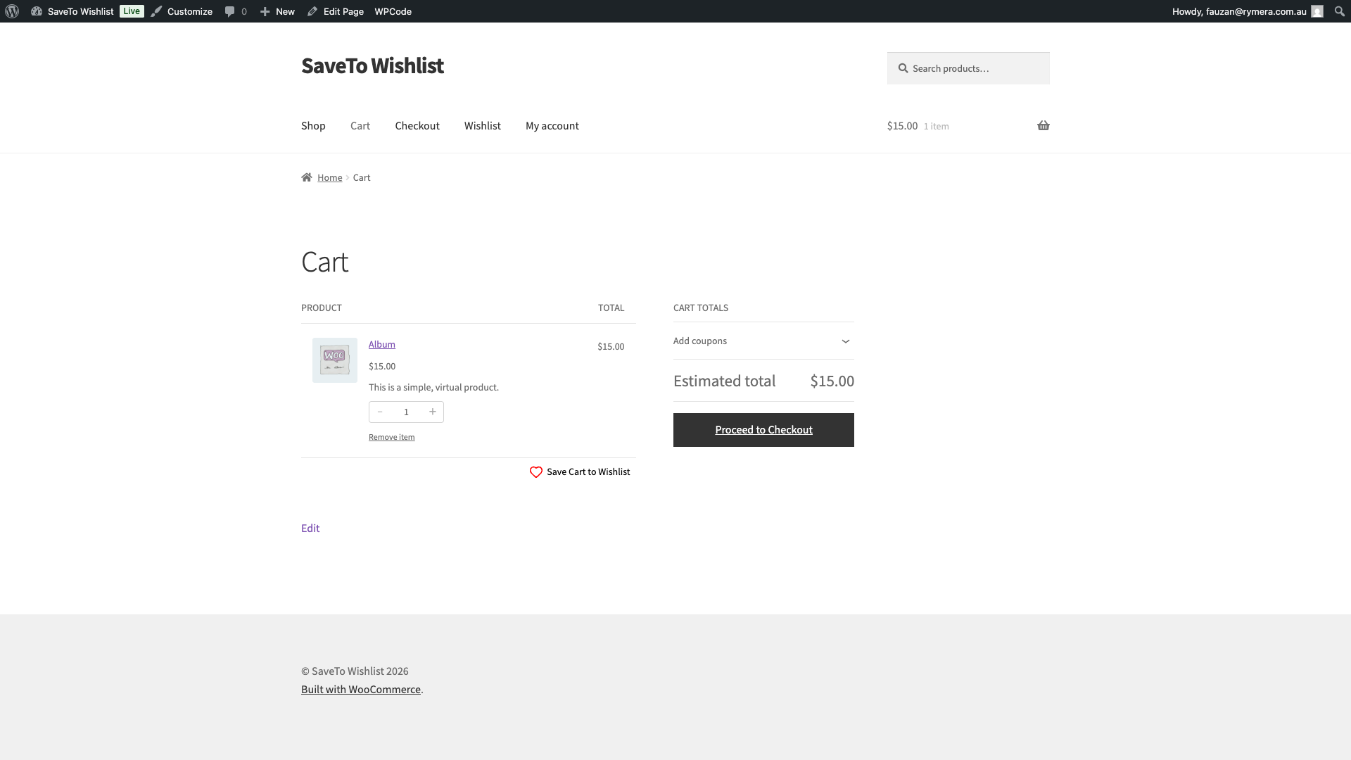 When a customer views the cart page, a Save Cart to Wishlist button appears below the cart items. This lets customers save their entire cart to a wishlist in one click, without going back to individual product pages.