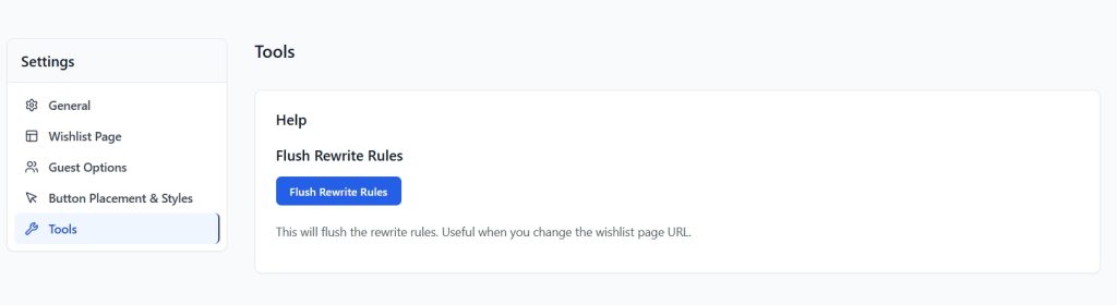 If you ever change your Wishlist Page URL, click the Flush Rewrite Rules button to refresh the site’s URL structure.