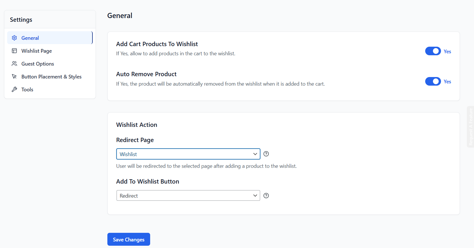 - Redirect Page – Choose which page users are redirected to after adding a product to their wishlist (e.g., the Wishlist page).