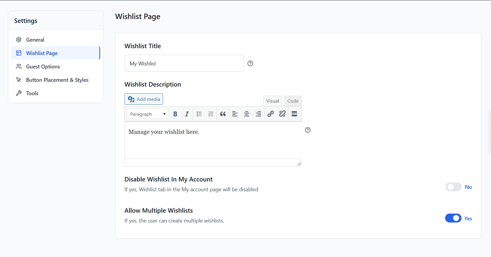 - Allow Multiple Wishlists – Enable this option to let users create and manage multiple wishlists.