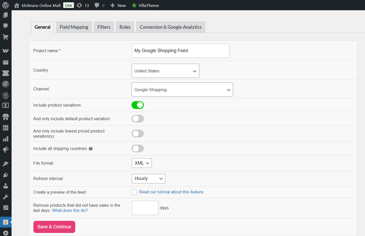 WordPress plugin settings screen showing a Google Shopping feed named 'My Google Shopping Feed' with country United States, XML format, hourly refresh.