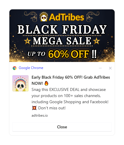 A PushEngage push notification alerting customers to the AdTribes Black Friday 60% Off sale