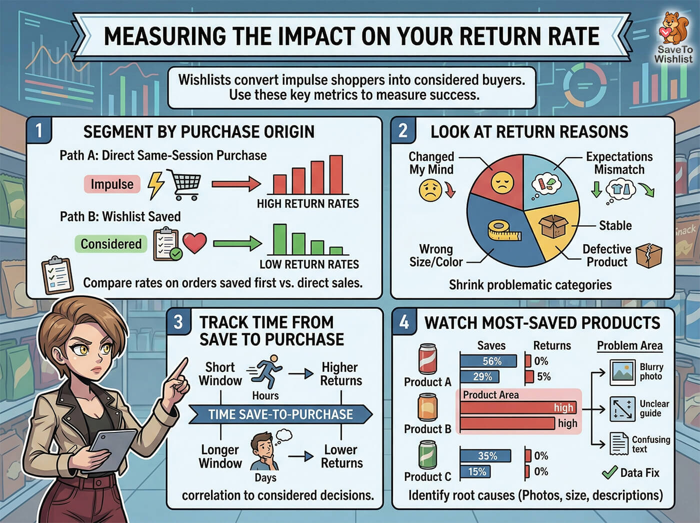Infographic explaining how wishlists and metrics โ€” purchase origin, return reasons, save-to-purchase time, and product saves โ€” reduce return rates.
