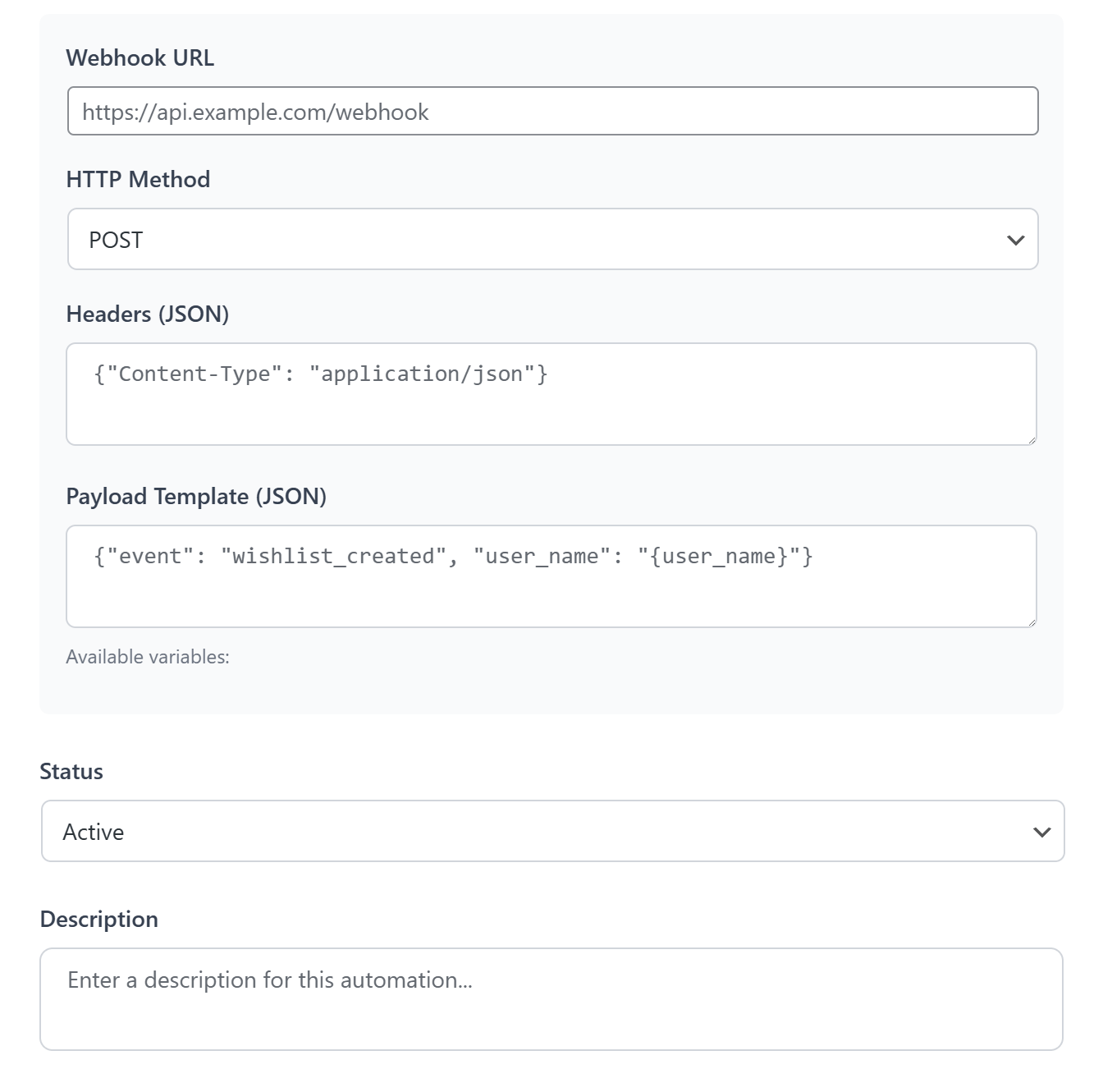 For instance, you might paste a link from a tool like Zapier to notify your team when a new wishlist is created. You can also enter specific product codes into the data field to keep your marketing lists organized and up to date.