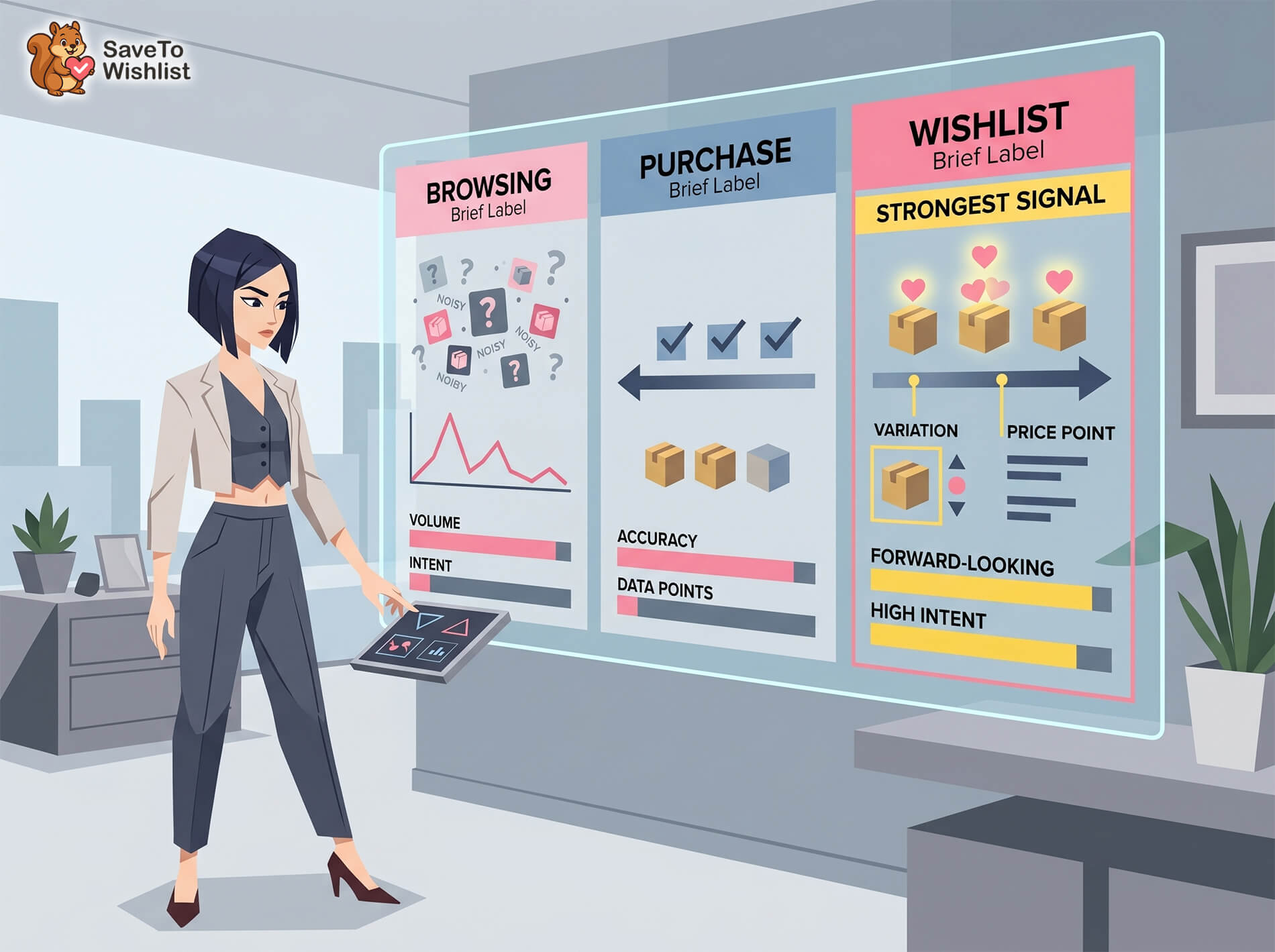 Not all customer data is created equal. To understand why wishlist data matters so much for WooCommerce product personalization, it helps to compare the three main types of behavioral signals available to ecommerce stores.